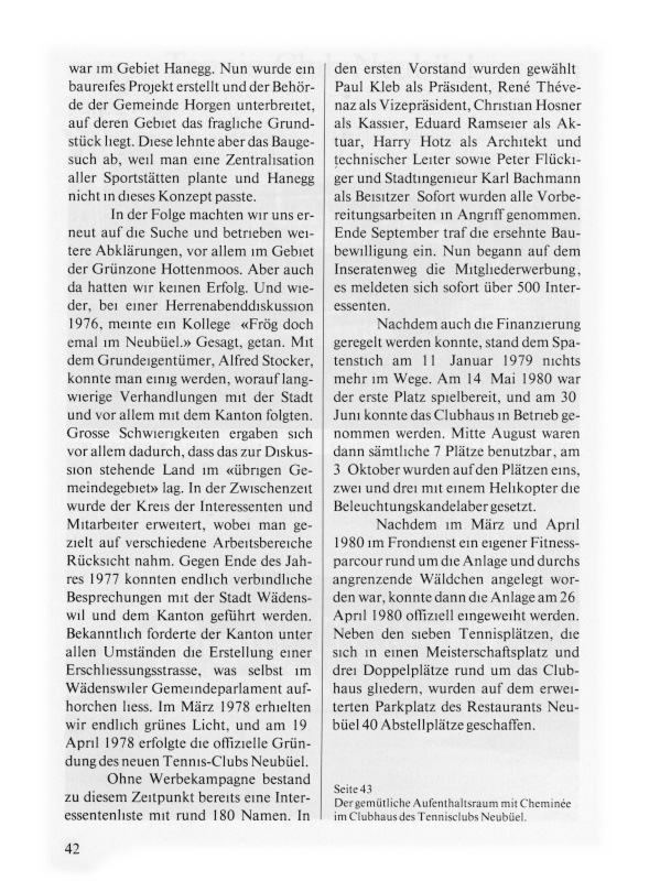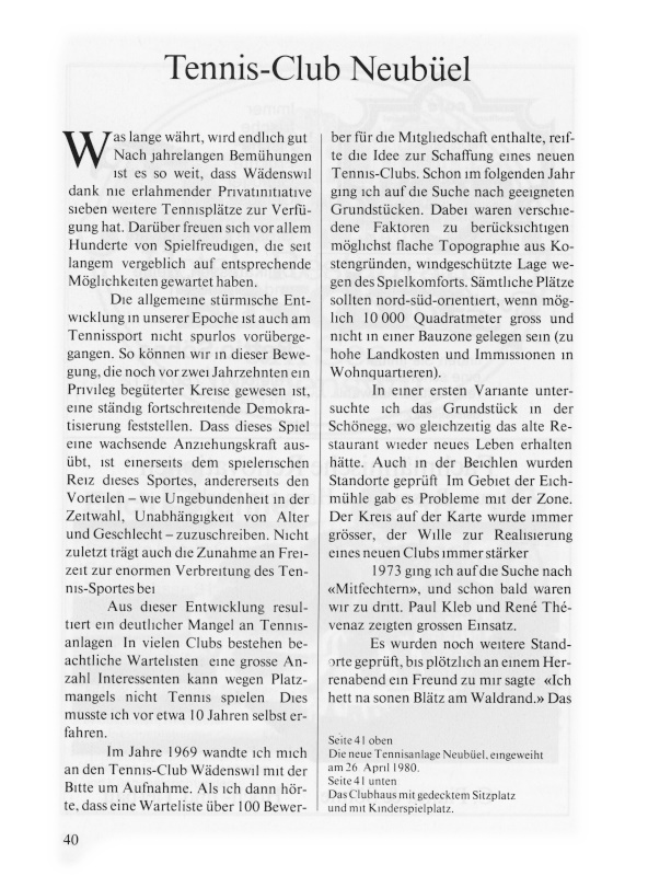 In der Folge machten wir uns erneut auf die Suche und betrieben weitere Abklärungen, vor allem im Gebiet der Grünzone Hottenmoos. Aber auch da hatten wir keinen Erfolg. Und wieder, bei einer Herrenabenddiskussion 1976, meinte ein Kollege: «Frög doch emal im Neubüel.» Gesagt, getan. Mit dem Grundeigentümer, Alfred Stocker, konnte man einig werden, worauf langwierige Verhandlungen mit der Stadt und vor allem mit dem Kanton folgten. Grosse Schwierigkeiten ergaben sich vor allem dadurch, dass das zur Diskussion stehende Land im «übrigen Gemeindegebiet» lag. In der Zwischenzeit wurde der Kreis der Interessenten und Mitarbeiter erweitert, wobei man gezielt auf verschiedene Arbeitsbereiche Rücksicht nahm. Gegen Ende des Jahres 1977 konnten endlich verbindliche Besprechungen mit der Stadt Wädenswil und dem Kanton geführt werden. Bekanntlich forderte der Kanton unter allen Umständen die Erstellung einer Erschliessungsstrasse, was selbst im Wädenswiler Gemeindeparlament aufhorchen liess. Im März 1978 erhielten wir endlich grünes Licht, und am 19. April 1978 erfolgte die offizielle Gründung des neuen Tennis-Clubs Neubüel.