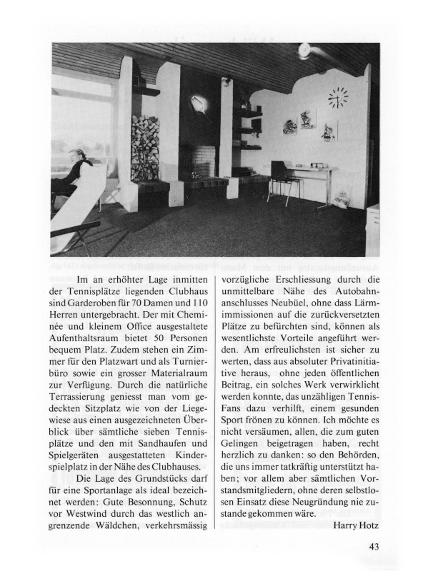 Die Lage des Grundstücks darf für eine Sportanlage als ideal bezeichnet werden: Gute Besonnung, Schutz vor Westwind durch das westlich angrenzende Wäldchen, verkehrsmässig vorzügliche Erschliessung durch die unmittelbare Nähe des Autobahnanschlusses Neubüel, ohne dass Lärmimmissionen auf die zurückversetzten Plätze zu befürchten sind, können als wesentliche Vorteile angeführt werden. Am erfreulichsten ist sicher zu werten, dass aus absoluter Privatinitiative heraus, ohne jeden öffentlichen Beitrag, ein solches Werk verwirklicht werden konnte, das unzähligen Tennis-Fans dazu verhilft, einem gesunden Sport frönen zu können. Ich möchte es nicht versäumen, allen, die zum guten Gelingen beigetragen haben, recht herzlich zu danken: so den Behörden, die uns immer tatkräftig unterstützt haben; vor allem aber sämtlichen Vorstandmitgliedern, ohne deren selbstlosen Einsatz diese Neugründung nie zustande gekommen wäre.