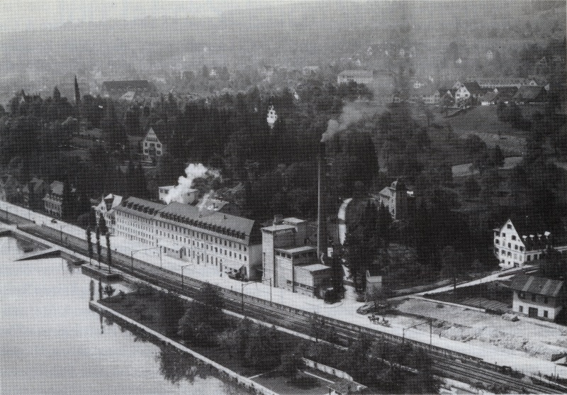 Fabrikanlage mit «Noredux»-Gebäude (rechts) aus den 1950er Jahren. Aufnahme um 1964.