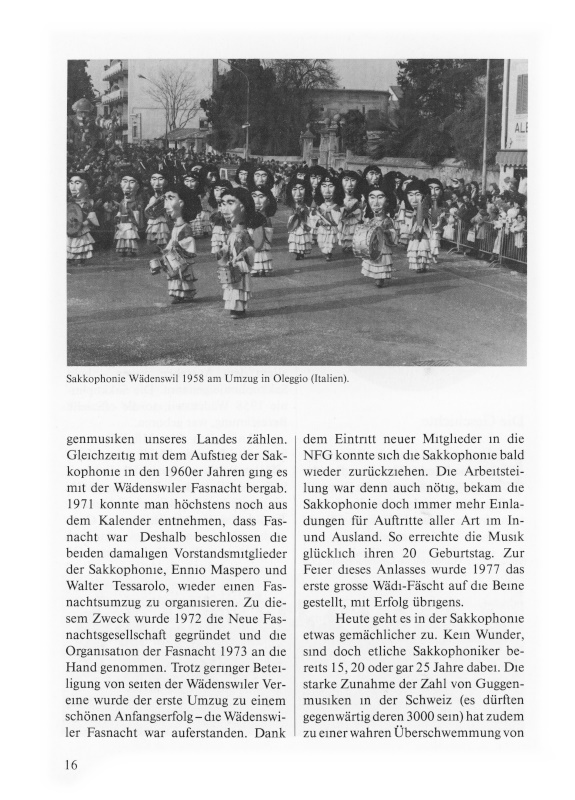 Neue Fasnachtsgesellschaft gegründet und die Organisation der Fasnacht 1973 an die Hand genommen. Trotz geringer Beteiligung von seiten der Wädenswiler Vereine wurde der erste Umzug zu einem schönen Anfangserfolg – die Wädenswiler Fasnacht war auferstanden. Dank dem Eintritt neuer Mitglieder in die NFG konnte sich die Sakkophonie bald wieder zurückziehen. Die Arbeitsteilung war denn auch nötig, bekam die Sakkophonie doch immer mehr Einladungen für Auftritte aller Art im In- und Ausland. So erreichte die Musik glücklich ihren 20. Geburtstag. Zur Feier dieses Anlasses wurde 1977 das erste grosse Wädi-Fäscht auf die Beine gestellt, mit Erfolg übrigens.
