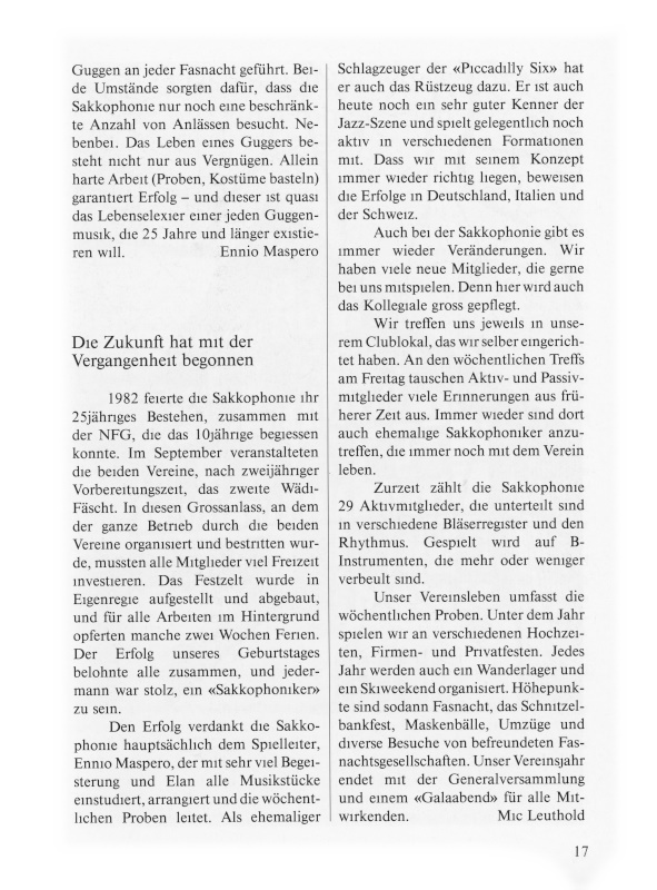 1982 feierte die Sakkophonie ihr 25jähriges Bestehen, zusammen mit der NFG, die das 10jährige begiessen konnte. Im September veranstalteten die beiden Vereine, nach zweijähriger Vorbereitungszeit, das zweite Wädi-Fäscht. In diesem Grossanlass, an dem der ganze Betrieb durch die beiden Vereine organisiert und bestritten wurde, mussten alle Mitglieder viel Freizeit investieren. Das Festzelt wurde in Eigenregie aufgestellt und abgebaut, und für alle Arbeiten im Hintergrund opferten manche zwei Wochen Ferien. Der Erfolg unseres Geburtstages belohnte alle zusammen, und jedermann war stolz, ein «Sakkophoniker» zu sein.
