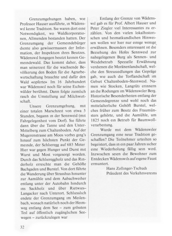 Grenzumgehungen haben, wie Professor Hauser ausführte, in Wädenswil keine Tradition. Sie waren dort eine Notwendigkeit, wo Waldkorporationen, Allmenden bestanden hatten. Der Grenzumgang der Gemeindebürger diente also gewissermassen der Information, der Inspektion ihres Besitzes. Wädenswil hingegen besitzt keinen Gemeindewald. Das kommt daher, dass man seinerzeit für die wachsende Bevölkerung den Boden für die Agrarbewirtschaftung brauchte und dafür den Wald «opferte». Im 16. Jahrhundert war Wädenswil noch für seine Eichenwälder berühmt. Dann folgte ziemlich rasch die Umstellung auf Milchwirtschaft.