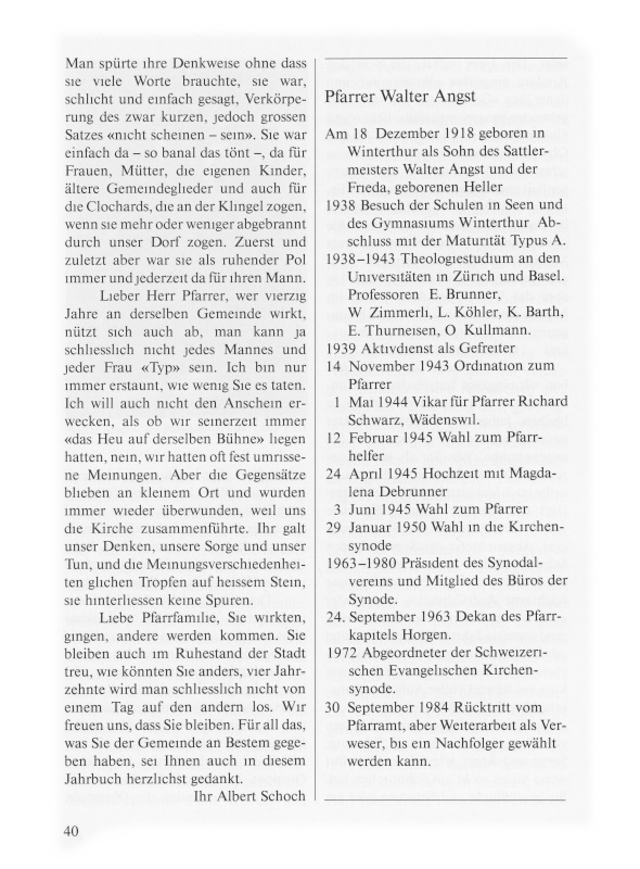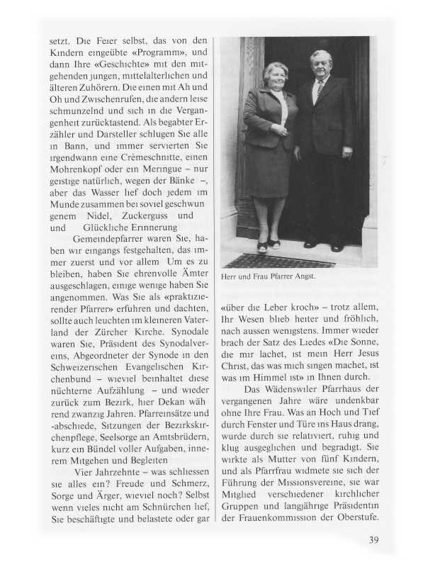 Vier Jahrzehnte − was schliessen sie alles ein? Freude und Schmerz, Sorge und Ärger, wieviel noch? Selbst wenn vieles nicht am Schnürchen lief, Sie beschäftigte und belastete oder gar «über die Leber kroch» − trotz allem, Ihr Wesen blieb heiter und fröhlich, nach aussen wenigstens. Immer wieder brach der Satz des Liedes «Die Sonne, die mir lachet, ist mein Herr Jesus Christ, das was mich singen machet, ist was im Himmel ist» in Ihnen durch.