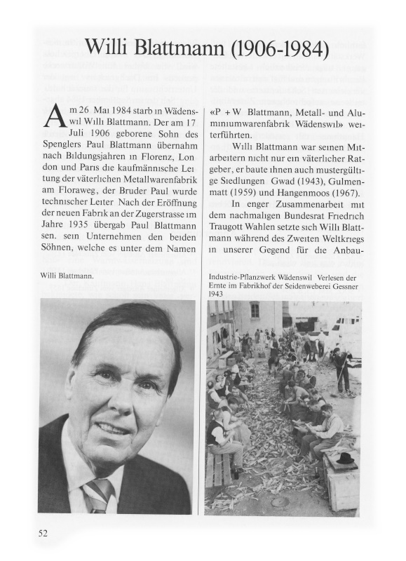 In enger Zusammenarbeit mit dem nachmaligen Bundesrat Friedrich Traugott Wahlen setzte sich Willi Blattmann während des Zweiten Weltkrieges in unserer Gegend für die Anbauschlacht ein. Das von ihm gegründete Industrie-Pflanzwerk Wädenswil bracht für die Selbstversorgung der Bevölkerung enorme Mengen von Kartoffeln, Kabis, Zuckerrüben, Mais und «Höckerli» hervor. In der Folge wurden auch in umliegenden Gemeinden Industrie-Pflanzwerke errichtet, so in Thalwil, Horgen und Glarus.