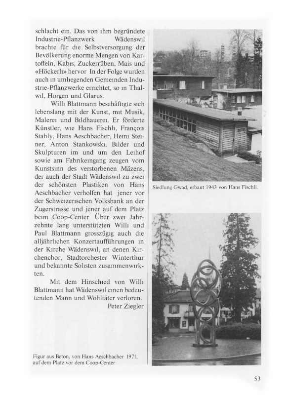 Hans Aeschbacher, Heini Steiner, Anton Stankowski. Bilder und Skulpturen im und um den Leihof, sowie am Fabrikeingang zeugen vom Kunstsinn des verstorbenen Mäzens, der auch der Stadt Wädenswil zu zwei der schönsten Plastiken von Hans Aeschbacher verholfen hat: jener vor der Schweizerischen Volksbank an der Zugerstrasse und jener auf dem Platz beim Coop-Center. Über zwei Jahrzehnte lang unterstützten Willi und Paul Blattmann grosszügig auch die alljährlichen Konzertaufführungen in der