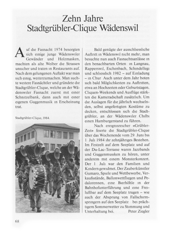 Nach ereignisreicher «Grübler-Zeit» feierten die Stadtgrübler-Clique über das Wochenende vom 29. Juni 1984 ihr zehnjähriges Bestehen. Im Festzelt auf dem Seeplatz und auf der Du-Lac-Terrasse waren Jazzbands und Guggenmusiken zu hören, unter anderem mit einem Monsterkonzert.