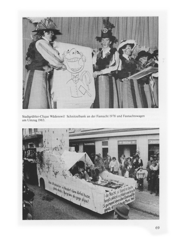 69a, b Stadtgrübler-Clique Wädenswil: Schnitzelbank an der Fasnacht 1978 und Fasnachtswagen am Umzug 1983.