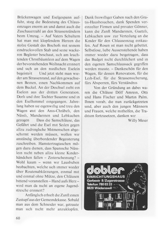 Der Chlauseinzug, früher jeweils um den 6. Dezember herum, wurde 1983 auf den ersten Adventssonntag verlegt. So gewannen die Chläuse etwas mehr Zeit für die vielen Hausbesuche. Zwanzig Chlauseinzüge prägten dieses eindrucksvolle Ereignis zum traditionellen – nicht mehr wegzudenkenden – Wädenswiler Volksbrauch. 1964 schritten die Samichläuse noch ohne Wagen und ohne Esel, die Säcke auf dem Rücken tragend, die Route ab. Jahr für Jahr wuchs das Interesse in der Bevölkerung. Und als die Zunft mit einem Brückenwagen und Eselgespann auffuhr, stieg die Bedeutung des Chlauseinzuges enorm an und damit auch die Zuschauerzahl an den Strassenrändern beim Umzug. – Auf Vaters Schultern hat man mit klopfendem Herzen die stolze Gestalt des Bischofs mit seinem eindrucksvollen Stab und seine wackeren Begleiter beschaut, sich am leuchtenden Christbäumlein auf dem Wagen der bevorstehenden Weihnacht erinnert und sich an den niedlichen Eselein begeistert ... Und jetzt steht man wieder am Strassenrand, auf den gewachsenen Beinen, einen Nachkommen auf dem Buckel. An der Deichsel zieht ein Eselein aus der dritten Generation. Dorli und ihre Tochter Susanne sind in den Eselhimmel eingegangen. Jahrelang haben sie eigenwillig und treu den Wagen mit den Anis-Chräbeli, den Nüssli, Mandarinen und Lebkuchen gezogen ... Dass die Samichläuse, das Gefährt und die Esel mit Seilen gegen allzu zudringliche Mitmenschen abgeschirmt werden müssen, wollen wir anständig überbordender Begeisterung zuschreiben. Hamstertragtaschen mögen dazu dienen, dass Spanische Nüsslein nicht neben allzu kleine Kinderhändchen fallen – Zeiterscheinung? - Wohl kaum, wenn wir Lausbuben beobachten, welche sich immer wieder über Routenabkürzungen, einmal mit und einmal ohne Mütze, den Chläusen bittend voranstellen – Hand aufs Herz – wird man da nicht an eigene Jugendstreiche erinnert?