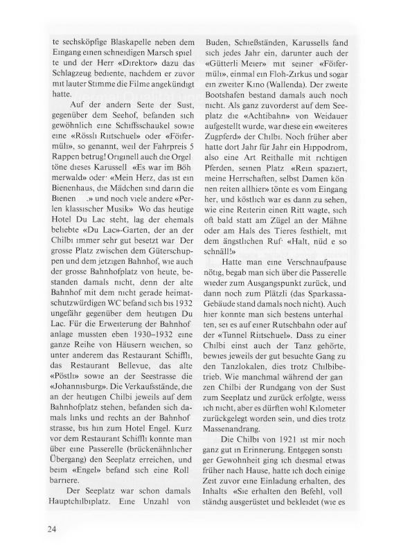 Plätzli (das Sparkassa-Gebäude stand damals noch nicht). Auch hier konnte man sich bestens unterhalten, sei es auf einer Rutschbahn oder auf der «Tunnel-Riitschuel». Dass zu einer Chilbi einst auch der Tanz gehörte, bewies jeweils der gut besuchte Gang zu den Tanzlokalen, dies trotz Chilbibetrieb. Wie manchmal während der ganzen Chilbi der Rundgang von der Sust zum Seeplatz und zurück erfolgte, weiss ich nicht, aber es dürften wohl Kilometer zurückgelegt worden sein, und dies trotz Massenandrang.
