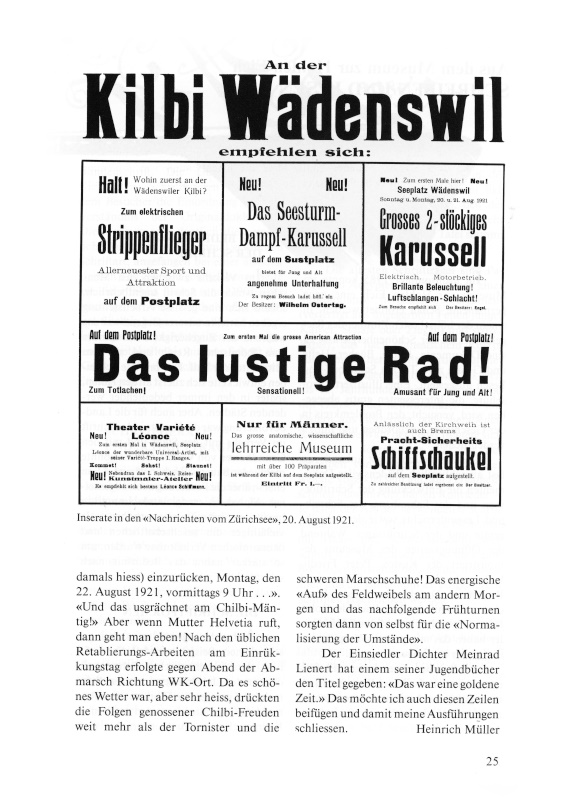 Seeplatz war schon damals Hauptchilbiplatz. Eine Unzahl von Buden, Schiessständen, Karussells fand sich jedes Jahr ein, darunter auch der «Gütterli-Meier» mit seiner «Föifermüli», einmal ein Floh-Zirkus und sogar ein zweiter Kino (Wallenda). Der zweite Bootshafen bestand damals auch noch nicht. Als ganz zuvorderst auf dem Seeplatz die «Achtibahn» von Weidauer aufgestellt wurde, war diese ein «weiteres Zugpferd» der Chilbi. Noch früher aber hatte dort Jahr für Jahr ein Hippodrom, also eine Art Reithalle mit richtigen Pferden, seinen Platz! «Rein spaziert, meine Herrschaften, selbst Damen können reiten allhier» tönte es vom Eingang her, und köstlich war es dann zu sehen, wie eine Reiterin einen Ritt wagte, sich oft bald statt am Zügel an der Mähne oder am Hals des Tieres festhielt, mit dem ängstlichen Ruf: «Halt, nüd e so schnäll!»