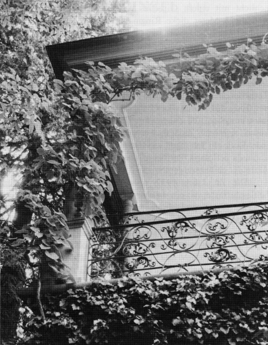Das eiserne Rankgerüst schwingt sich beidseitig des Portikus in je zwei Bögen der Hausfassade entlang und bildet einen offenen Vorraum zum Haus. Der Boden dieser Veranda ist gut 30 Zentimeter höher als seine Umgebung und mit mehrfarbigen Fayence-Plättchen belegt. Ein sehr schönes schmiedeisernes Geländer und eine Blumenrabatte begrenzen den Vorraum zum Weg hin.