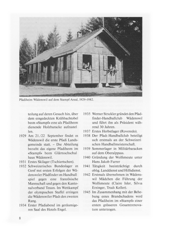 1929 Am 21./22. September findet in Wädenswil die erste Pfadi-Landsgemeinde statt. – Die Abteilung bezieht das eigene Pfadiheim im «Stampf» beim Glärnischschulhaus Wädenswil.