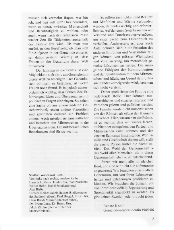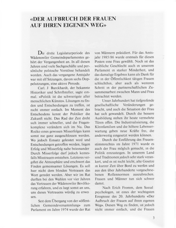 Nach Erich Fromm, dem Sozialpsychologen, ist eines der wichtigsten Ereignisse des 20. Jahrhunderts «Der Aufbruch der Frauen auf ihren eigenen Weg». Diesen Weg zu finden, ist jedoch nicht immer einfach, und die Frauen müssen sich vermehrt fragen: wer bin ich, und was will ich? Dies besonders, wenn es heisst, zwischen Mutterschaft und Berufstätigkeit zu wählen, oder auch, wenn nach der familiären Phase wieder Zeit für Tätigkeiten ausserhalb der Familie frei wird. Ob man nun zurück in den Beruf geht, ob man sich für Aufgaben in der Gemeinde einsetzt, sei dahingestellt. Wichtig ist, dass Frauen an der Gestaltung dieser Welt mitwirken.