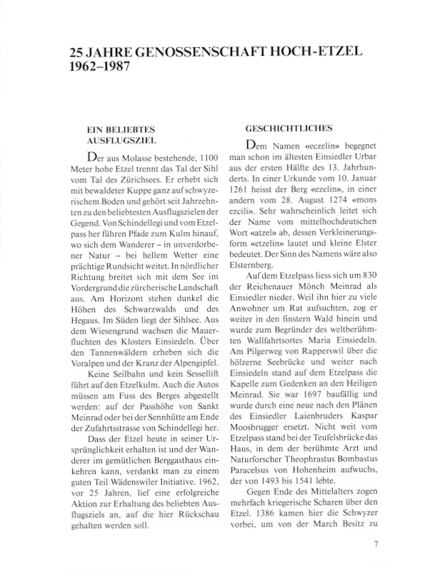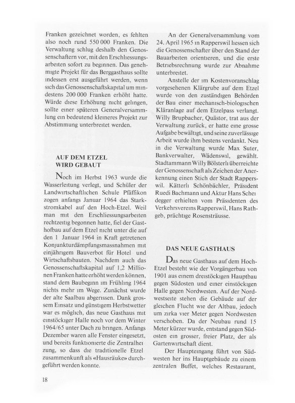 Anschaffung einer zweiten Pumpe zur Förderung von Trinkwasser vom Reservoir Ragenau auf den Hoch-Etzel. Vom Kloster Einsiedeln können rund 3400 Quadratmeter Land südlich des Gasthauses erworben werden. Damit ist der ganze Hoch-Etzel Besitz der Genossenschaft. Hugo Ankli hat zusammen mit seinen Kameraden der SAC-Sektion Zindelspitz den Strickliweg verbessert. Nun führt ein schöner Wanderweg von Feusisgarten zum Etzel. Der Genossenschaft sind dafür keinerlei Kosten verrechnet worden.