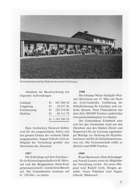 Carl Röllin, Mitglied der Verwaltung seit 1962, erklärt den Rücktritt. Rudolf Gisler, Pfäffikon SZ, und Peter Schwarzenbach, Richterswil, werden als neue Mitglieder der Verwaltung gewählt. Als Kontrollstelle wird die Kantonalbank Schwyz bestimmt. Erstmals wird den Teilnehmern an der Generalversammlung ein bescheidener «Zvieri» offeriert. Wegverbesserungen auf der Südseite des Etzels durch «Frondienst-Arbeitern.