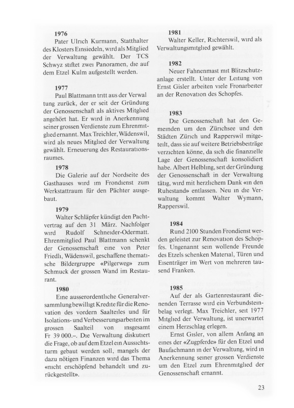 Auf der als Gartenrestaurant dienenden Terrasse wird ein Verbundsteinbelag verlegt. Max Treichler, seit 1977 Mitglied der Verwaltung, ist unerwartet einem Herzschlag erlegen. Ernst Gisler, von allem Anfang an eines der «Zugpferde» für den Etzel und Baufachmann in der Verwaltung, wird in Anerkennung seiner grossen Verdienste um den Etzel zum Ehrenmitglied der Genossenschaft ernannt.