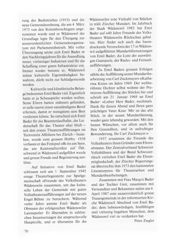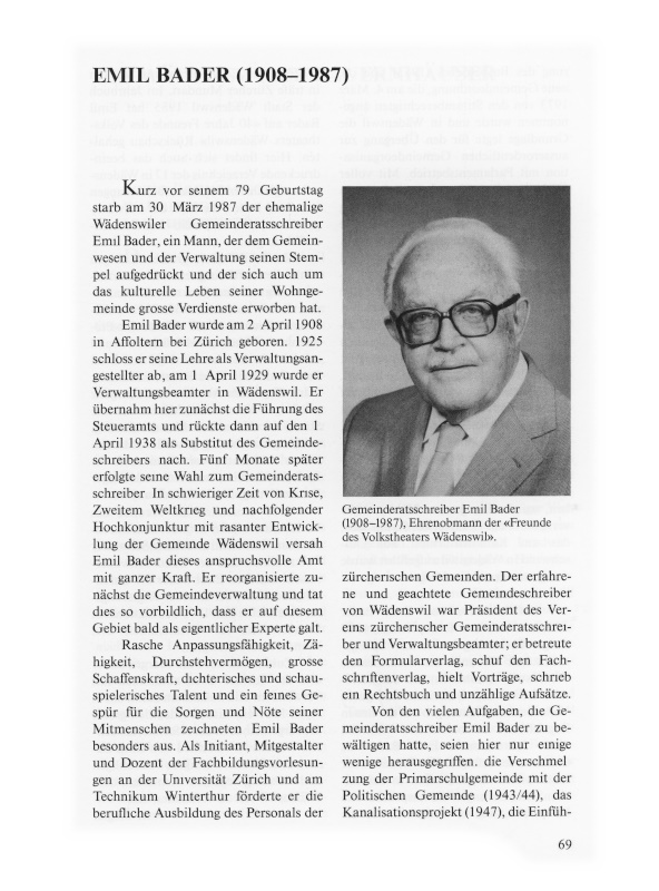 «Freunde des Volkstheaters Wädenswil» zusammen, um das kulturelle Leben der Gemeinde mit guten Volkstheateraufführungen auf der neuen Engel-Bühne zu bereichern. Während vieler Jahre amtete Emil Bader als Obmann der erfolgreichen Wädenswiler Laienspieler. Er übernahm in zahlreichen Inszenierungen die anspruchsvolle Hauptrolle, und er übersetzte für die Wädenswiler eine Vielzahl von Stücken in träfe Züricher Mundart. Im Jahrbuch 1985 hat Emil Bader auf «40 Jahre Freunde des Volkstheaters Wädenswil» Rückschau gehalten. Hier findet sich auch das beeindruckende Verzeichnis der 17 in Wädenswil aufgeführten Mundartübersetzungen von Emil Bader, die Liste der auswärtigen Gastspiele, der Radio- und Fernsehaufführungen.