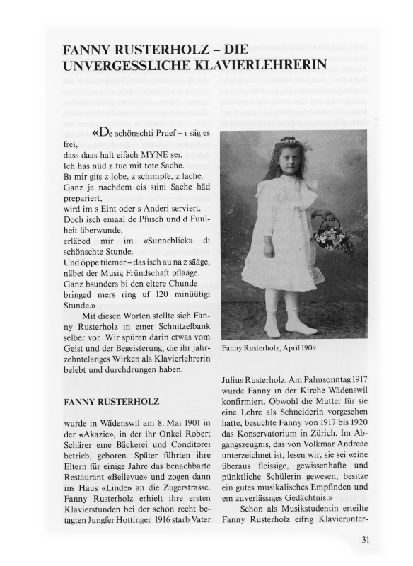 Mit diesen Worten stellte sich Fanny Rusterholz in einer Schnitzelbank selber vor. Wir spüren darin etwas vom Geist und der Begeisterung, die ihr jahrzehntelanges Wirken als Klavierlehrerin belebt und durchdrungen haben.