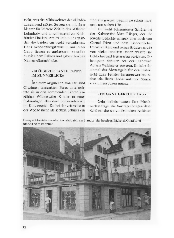 32 Fannys Geburtshaus «Akazie» erhob sich am Standort der heutigen Bäckerei/Conditorei Brändli beim Bahnhof.