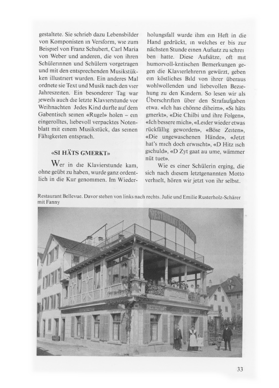 «Am Mittwochnachmittag ging ich wie gewohnt in die Klavierstunde. Mit einem schlechten Gewissen, weil ich nicht geübt hatte, sprang ich die Treppe zur Haustüre empor. Mit einem freundlichen Lächeln öffnete mir Fräulein Rusterholz die Türe. Ich dachte: Wenn sie wüsste, wie wenig ich geübt hatte, dann würde sie nicht mehr lachen. Ich setzte mich auf das Ofenbänkchen, wo ich, nicht lange blieb, denn nun kam ich an die Reihe.