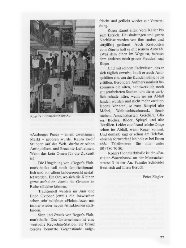 Und mit seinem Fachwissen, das er sich täglich erwirbt, kauft er auch Antiquitäten ein, um die Kundenwünsche zu erfüllen. Besondere Aufmerksamkeit bekommen die alten, handwerklich noch gut gearbeiteten Sachen, um die es wirklich schade wäre, wenn sie im Abfall landen würden und nicht mehr «weiterleben» könnten, so zum Beispiel alte Möbel, Weihnachtsschmuck, Spielsachen, Ansichtskarten, Geschirr, Gläser, Bücher, Bilder, Spiegel und alte Textilien. Leider zu oft sind solche Dinge schon im Abfall, wenn Roger kommt. Und deshalb sagt er schon am Telefon: «Nichts fortwerfen! Ich hole es bei Ihnen ab!» Telefonieren Sie mir unter (01) 780 70 80.