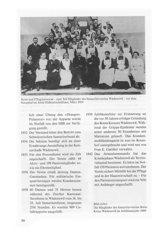 Jubiläumsfeier zur Erinnerung an die vor 50 Jahren erfolgte Gründung des Roten Kreuzes Wädenswil. Während der Grippe-Epidemie werden unter anderem 30 Eisenbetten mit Matratzen gekauft. Das Krankenmobilien-Magazin ist nun im