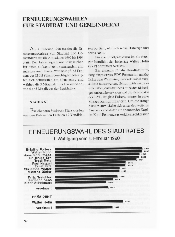 Ein erstmals für die Resultatermittlung eingesetztes EDV-Programm ermöglichte dem Wahlbüro, laufend Zwischenresultate auszuwerten. Schon früh zeigte es sich dabei, dass die sechs Sitze der Bisherigen unbestritten waren und die Kandidatin der EVP, Brigitte Poltera, immer in einer Spitzenposition figurierte. Um die Ränge 8 und 9 entwickelte sich unter den weiteren 5 neuen Kandidaten ein spannendes Kopf-an-Kopf-Rennen, aus welchem schliesslich Vinzenz Bütler (CVP) und Christof Wolfer (LdU) als Sieger hervorgingen.