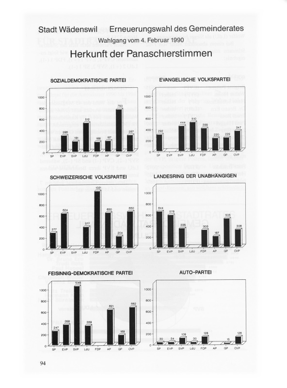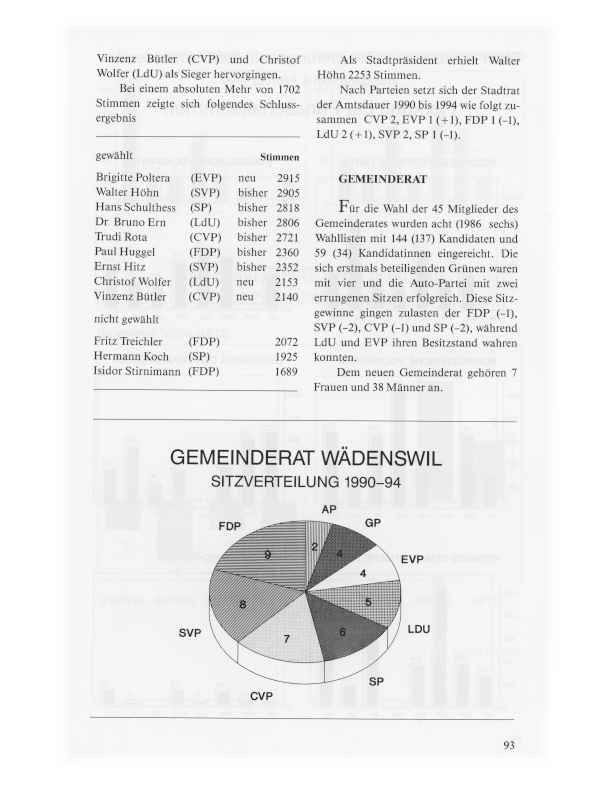 Nach Parteien setzt sich der Stadtrat der Amtsdauer 1990 bis 1994 wie folgt zusammen: CVP 2, EVP 1 (+ 1), FDP 1 (-1), LdU 2 (+ 1), SVP 2, SP 1 (-1).