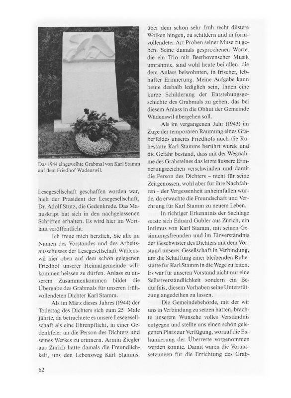 Dr. Weber bitten, das Grabmal in die treue Obhut der Gemeinde zu nehmen, in die Obhut der Heimatgemeinde des Dichters. Ich zweifle nicht, dass dieser Bitte entsprochen werden wird, durften wir doch das grosse Verständnis, das unsere gegenwärtige Behörde für das dichterische Schaffen Karl Stamms besitzt, in reichem Masse wahrnehmen.