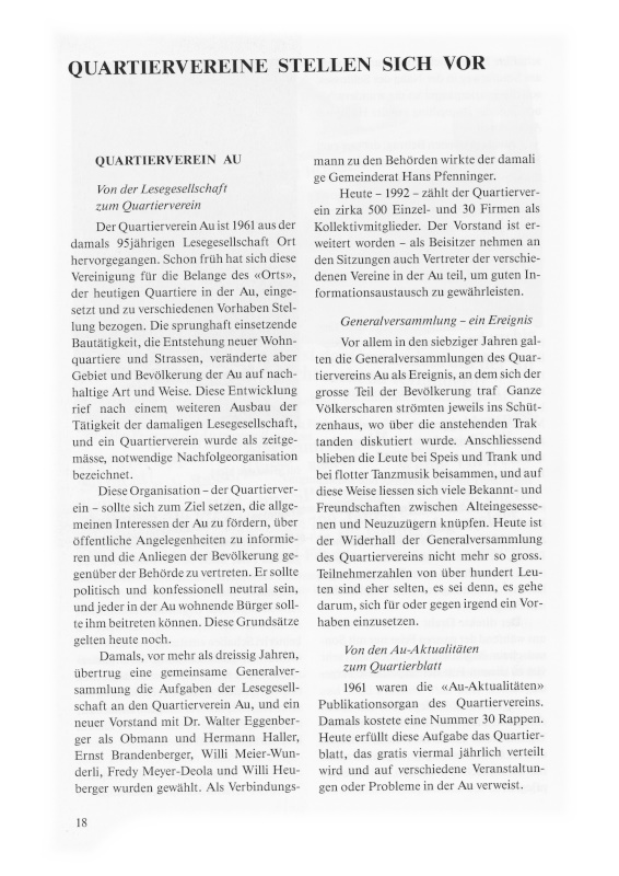 Alle diese Bespiele zeigen auf, dass es dem Quartierverein Au nach wie vor daran liegt, als Bindeglied zwischen Alteingesessenen und Neuzugezogenen und im Interesse der Bevölkerung der Au zu wirken. Dies war der Grundgedanke bei der Gründung – er gilt heute und soll auch in Zukunft weitergepflegt werden.