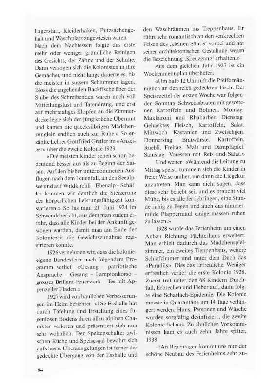 «Etliche Mühe und Aufregung gab es, bis jedem der 30 Mädchen und 36 Knaben Lagerstatt, Kleiderhaken, Putzsachengehalt zugewiesen waren … Nach dem Nachtessen folgte das erst mehr oder weniger gründliche Reinigen des Gesichts, der Zähne und der Schuhe. Dann verzogen sich die Kolonisten in ihre Gemächer, und nicht lange dauerte es, bis die meisten in süssem Schlummer lagen. Bloss die angehenden Backfische über der Stube des Schreibenden waren noch voll Mitteilungslust und Tatendrang, und erst auf mehrmaliges Klopfen an die Zimmerdecke legte sich der jüngferliche Übermut und kamen die quecksilbrigen Mädchenzünglein endlich auch zur Ruhe.» So erzählte Lehrer Gottfried Gretler im «Anzeiger» über die zweite Kolonie 1923.