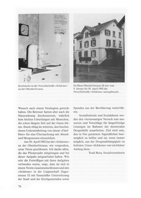 Am 30. April 1992 hat der «Schärme» an der Oberdorfstrasse, wie vorgesehen, seine Türen geschlossen. Ich danke allen, die das Pilotprojekt mitgetragen und bei dieser Aufgabe mitgearbeitet haben. Wie sehr die Freiwilligen mit ihren Aufgaben verbunden waren, zeigt, dass sie sich in einem Verein zusammenschlossen und den «Schärme» in der Liegenschaft Zugerstrasse 52 mit finanzieller Unterstützung der Stadt und der Kirchgemeinden sowie Spenden aus der Bevölkerung weiterführen.