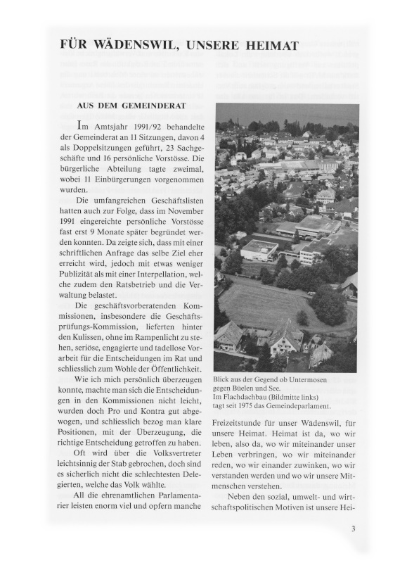 Im Amtsjahr 1991/92 behandelte der Gemeinderat an 11 Sitzungen, davon 4 als Doppelsitzungen geführt, 23 Sachgeschäfte und 16 persönliche Vorstösse. Die bürgerliche Abteilung tagte zweimal, wobei 11 Einbürgerungen vorgenommen wurden.
