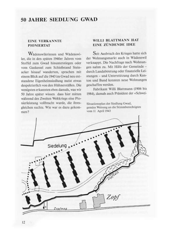 Wädenswilerinnen und Wädenswiler, die in den späten 1940er Jahren vom Stoffel zum Gwad hinunterstiegen oder vom Gaskessel zum Schießstand Steinacker hinauf wanderten, sprachen mit einem Blick auf die 1943 im Gwad neu entstandene Eigenheimsiedlung meist etwas despektierlich von den Hühnerställen. Die wenigsten erkannten eben damals, was wir 50 Jahre später wissen: dass hier mitten während des Zweiten Weltkriegs eine Pionierleistung vollbracht wurde, die ihresgleichen suchte. Wie war es dazu gekommen?