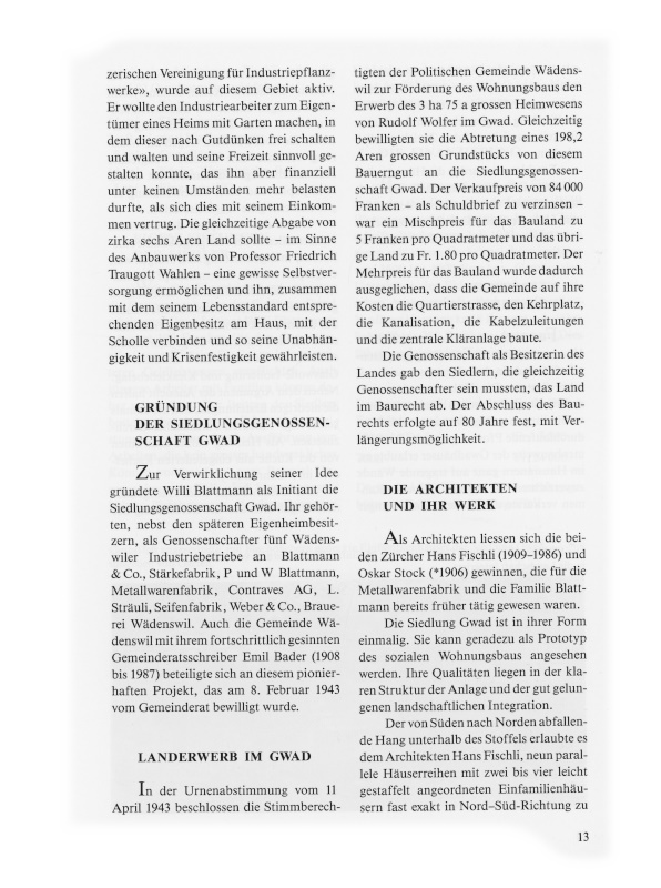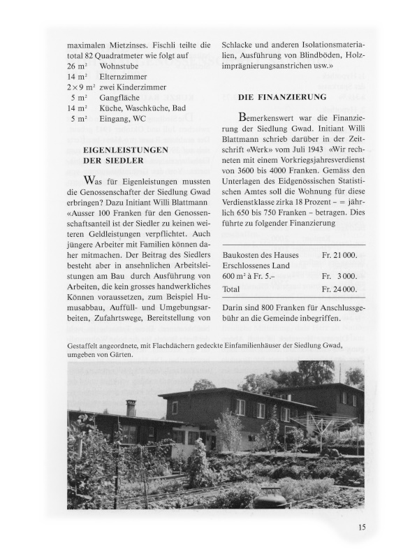 Bemerkenswert war die Finanzierung der Siedlung Gwad. Initiant Willi Blattmann schrieb darüber in der Zeitschrift «Werk» vom Juli 1943: «Wir rechneten mit einem Vorkriegsjahresverdienst von 3600 bis 4000 Franken. Gemäss den Unterlagen des Eidgenössischen Statistischen Amtes soll die Wohnung für diese Verdienstklasse zirka 18 Prozent – = jährlich 650 bis 750 Franken – betragen. Dies führte zu folgender Finanzierung: