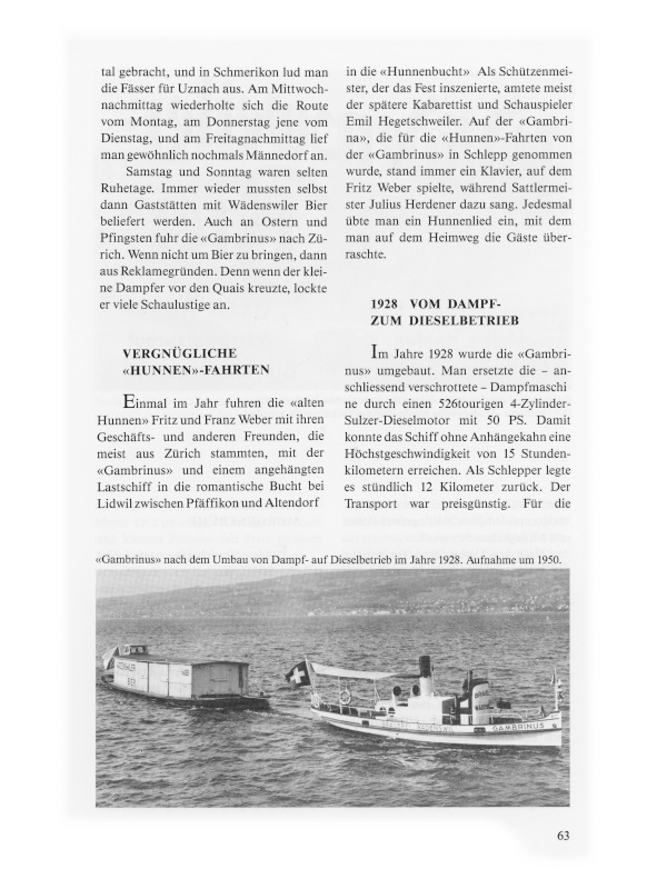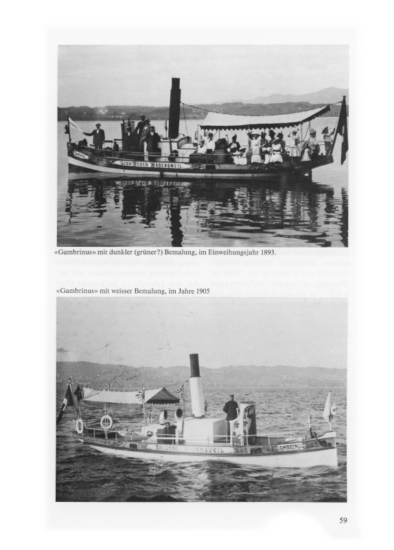 Die «Gambrinus» ist das älteste noch im Originalzustand erhaltene Schiff auf dem Zürichsee, das einst gewerblichen Zwecken diente. Die offizielle Jubiläumsfeier «100 Jahre Gambrinus» findet am Samstag, 21. August 1993, auf dem Landgut von Paul Weber-Glystras in der Rietliau Wädenswil statt. Im Hinblick auf die denkwürdige Feier ist auch diese kleine Geschichte des legendären Schleppers verfasst worden.