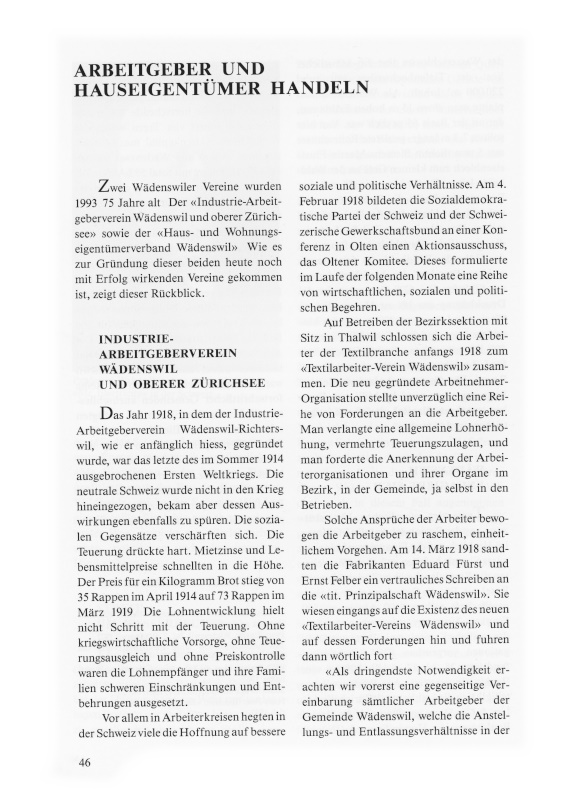 Das Verhältnis zwischen Arbeitgebern und Arbeitnehmern war auch in der Region Wädenswil gespannt. Unter dem Eindruck der innenpolitischen Verhältnisse in der Schweiz verschärfte es sich zusehends. Zum Bruch kam es in Wädenswil ebenfalls während des Landesstreiks vom 11. bis 15. November 1918. Der Chronist der Lesegesellschaft Wädenswil zog nach dem für die Arbeiter enttäuschenden Streikabbruch folgende Bilanz: «Nicht berauschendes Siegesgefühl beherrscht die Bürgerlichen, sondern der feste Wille zu einer Sozialpolitik, die sich den Verhältnissen besser anzupassen versteht, als es vorher der Fall war.» Und auf diesem Gebiet wartete der vor 75 Jahren in Wädenswil gegründete Industrie-Arbeitgeberverein bald auch mit Leistungen auf.