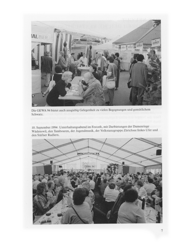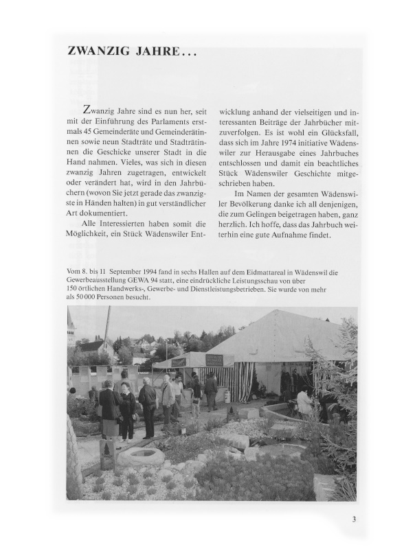 3 Vom 8. bis 11. September 1994 fand in sechs Hallen auf dem Eidmattareal in Wädenswil die Gewerbeausstellung GEWA 94 statt, eine eindrückliche Leistungsschau von über 150 örtlichen Handwerks-, Gewerbe- und Dienstleistungsbetrieben. Sie wurde von mehr als 50 000 Personen besucht.