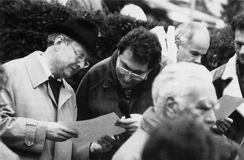 10. Dezember 1994: Tag der Menschenrechte. Auf dem Schwanenplatz manifestieren rund 80 Wädenswilerinnen und Wädenswiler ihre Soldarität mit jenen Menschen, an denen Menschenrechtsverletzungen begangen werden. Von links nach rechts: Gemeinderatspräsident Dr. Bernhard Rom, Pfarrer Konrad Müller, Pfarrer Hans Suter, dahinter Pfarrer Martin Kopp.
