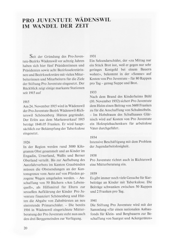 Der Pro-Juventute-Bezirk Wädenswil kann auf achtzigjährige erfolgreiche Tätigkeit zurückblicken. Allein von 1978 bis 1995 wurden 309‘000 Franken aufgewendet für Hilfe an Kinder, Jugendliche, Familien, Elternbildung, Gesundheitsförderung und Suchtprophylaxe, für Freizeit und Spiel, drei Ludotheken sowie für Projekte in den Bereichen Jugendhilfe, Jugendheime, Jugendvereine und Jugendinstitutionen.