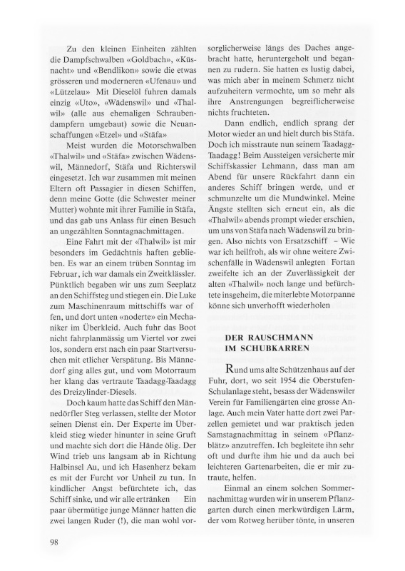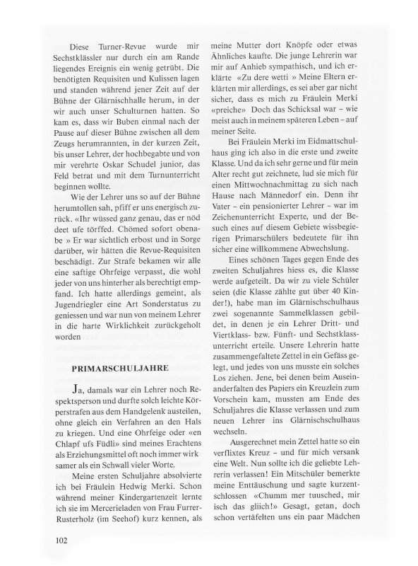 Ausgerechnet mein Zettel hatte so ein verflixtes Kreuz − und für mich versank eine Welt. Nun sollte ich die geliebte Lehrerin verlassen! Ein Mitschüler bemerkte meine Enttäuschung und sagte kurzentschlossen: «Chumm mer tuusched; mir isch das gliich !» Gesagt, getan; doch schon vertäfelten uns ein paar Mädchen und riefen: «Fröilein Merki, de Seppli und de Max händ tuuschet!»