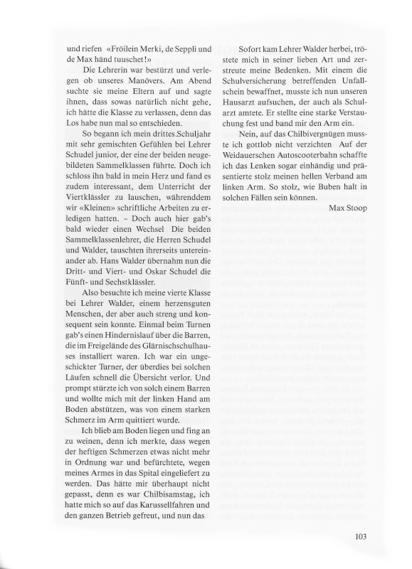 Also besuchte ich meine vierte Klasse bei Lehrer Walder, einem herzensguten Menschen, der aber auch streng und konsequent sein konnte. Einmal beim Turnen gab's einen Hindernislauf über die Barren, die im Freigelände des Glärnischschulhauses installiert waren. Ich war ein ungeschickter Turner, der überdies bei solchen Läufen schnell die Übersicht verlor. Und prompt stürzte ich von solch einem Barren und wollte mich mit der linken Hand am Boden abstützen, was von einem starken Schmerz im Arm quittiert wurde.