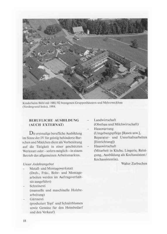 Nach mehr als vierjähriger Bauzeit kann am 4. Juli 1984 die total renovierte und erweiterte Heimanlage eingeweiht werden. Der Bühl-Betrieb umfasst nun zweckmässige Schulräume für heilpädagogisch geführte Kleinklassen, eine behindertengerechte Turnhalle, Gruppenwohnhäuser für Kinder und Jugendliche sowie Werkstätten, Garten- und Landwirtschaftsbetriebe für die erstmalige berufliche Ausbildung.