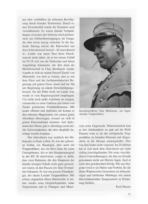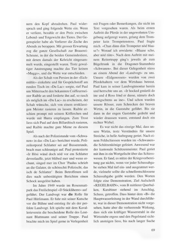 Kavallerieverein die bescheidene Rolle des Leutnant Blattman und seiner Truppe. Paul brachte mich im Spiel gerne in Verlegenheit mit Fragen oder Bemerkungen, die nicht im Text vorgesehen waren. Als beim ersten Auftritt die Pferde in der ungewohnten Umgebung aufgeregt waren, gelang dem Trompeter kein Trompetenstoss. Paul fragte mich: «Chan dänn diin Trompeter nöd blaase?» Worauf ich erwiderte: «Blaase scho, aber nöd riite». Nach dem Auftritt mit meinem Reitertrupp ging’s jeweils ab zum Bügeltrunk in die Dragoner-Stammbeiz «Schwanen». Bei dieser Gelegenheit stiess an einem Abend der «Landvogt» zu uns. Unsere «Eidgenossen» wurden von zwei Pferdehaltern vor dem Wirtshaus betreut. Paul kam in seiner Landvogtmontur herein und herrschte uns an: «Ir hocked gmütli do ine und d Ross lönd er dusse, nämets doch wenigschtens au ine». Und schon wurden unsere Rösser, zum Schrecken der braven Wirtin, in die Gaststube geführt. Bis sie dann in der engen Gaststube gedreht und wieder draussen waren, entstand doch ein rechter Wirbel.