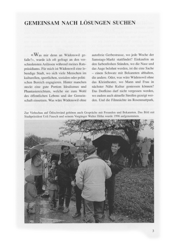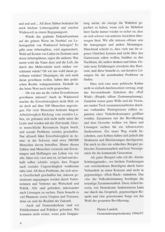 Dass sich eine neue politische Kultur nicht so einfach durchzusetzen vermag, zeigt das bevorstehende Scheitern des «PoZ Wädi» (Projekt offene Zentrumsplanung). Zunächst waren guter Wille und die Vision, am runden Tisch zusammenzuarbeiten durchaus vorhanden. Parteigrenzen sollten zugunsten eines Verkehrskonzeptes geöffnet werden. Zusammen mit der Bevölkerung und dem Gewerbe wollten wir Ideen und Lösungen suchen für ein lebenswertes Stadtzentrum. Ein neuer Weg wurde beschritten, zum Schluss habe sich jedoch alte Strukturen und Blockierungen durchgesetzt. Für mich ist dies ein schlechtes Beispiel politischer Zusammenarbeit und keine Vorzeigestück für die kommende Generation.