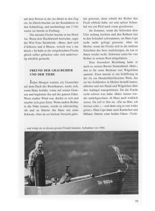 Auch nachdem Hans am 30. April 1990 in seinem 78. Lebensjahr seinen Beruf aufgegeben hatte, ging er jeden Tag nach Naglikon, seine Tiere füttern. Viel und gerne sass er unter dem wetterfesten Vordach seines Schöpfchens. Dieser traute Winkel ist durch einen Stapel Holzkistchen, in denen früher Fische transportiert wurden, vom Nordwestwind abgeschirmt. Zahlreich waren die Besucherinnen und Besucher von nah und fern, mit denen er über Gott und die Welt diskutierte und sich mit ihnen aufs beste unterhielt. Erstaunlich, wie viele Leute er kannte und wie genau er über die Geschichten der Familien aus der Au Bescheid wusste. Einmal machte sogar eine Frau aus Chur in der Au Zwischenhalt, um den Mann kennenzulernen, den sie täglich vom Schnellzug aus unter seinem Vordach sitzen sah.