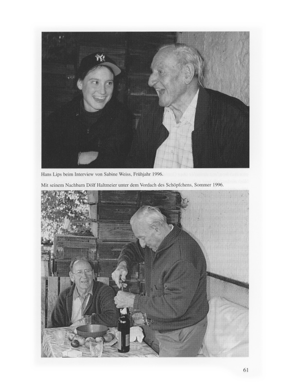 Unter dem Vordach seines Schöpfchens empfing er auch die Schülerinnen und Schüler, die ihn jedes Jahr einzeln oder gruppenweise interviewten und sich nach seinen Erlebnissen, Erfahrungen und Ansichten und den vergangenen Zeiten erkundigten. Er bewirtete sie grosszügig, und sie waren begeistert von seiner lebhaften Erzählweise und seinem Humor. Schon wie er sich ihnen vorstellte, war einmalig: «Ich bi de Hans Lips, hesch voorigs Gält, so gib's!» Als er sich verabschiedete, meinte er: «So, jetzt mues i na de Hüener go d Schwänz uebinde, dass wider brav legged.» Während des Winters 1996 sagte Hans öfter: «Mini Pumpi wott eifach nümme so rächt» und zeigte auf sein Herz, «uf eimal nimmt's di halt um der Egge, da chasch nüüt mache.»
