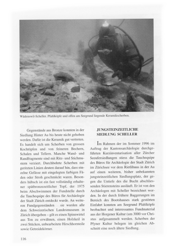 Im Rahmen der im Sommer 1996 durchgeführten Kurzinventarisation der Zürcher Seeufersiedlungen stiess die Tauchequipe im See vor dem Rietlihuus auf einen weiteren jungsteinzeitlichen Siedlungsplatz, der gegen die Untiefe des die Bucht abschliessenden Stierensteins ausläuft. Er ist mit Scheller bezeichnet worden. In der durch Baggerungen im Bereich des Bootshauses stark gestörten Einfahrt konnte am Seegrund interessantes Fundmaterial aus der Horgener Kultur (um 3000 vor Christus) aufgesammelt werden. Scherben der Pfyner Kultur belegen im gleichen Abschnitt eine noch ältere Siedlung.
