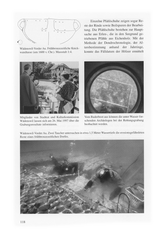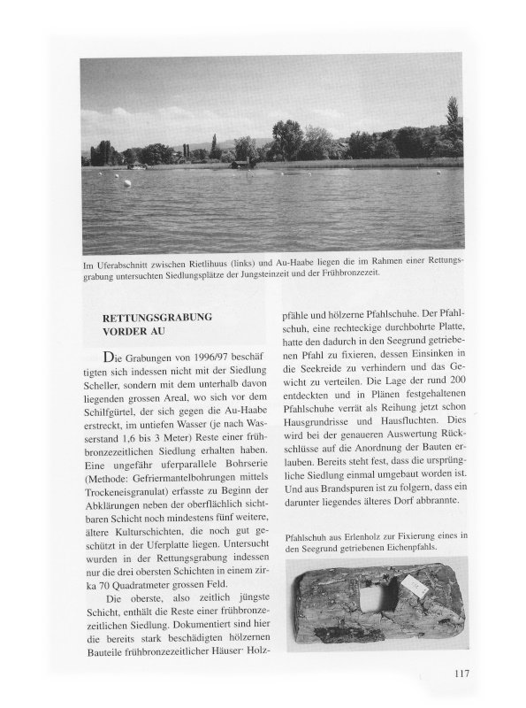 Im Rahmen einer Kurzinventarisation der Zürcher Seeufersiedlungen, welche das Büro für Archäologie der Stadt Zürich im Sommer 1996 im Auftrag der Kantonsarchäologie Zürich durchführte, wurden im Ufergebiet von Wädenswil drei bisher unbekannte prähistorische Siedlungsplätze entdeckt. Zwischen Rietlihuus und Au-Haabe untersuchen seit November 1996 Taucher in einer kleinflächigen Unterwasser-Rettungsgrabung Siedlungsspuren aus der Jungsteinzeit und der Frühbronzezeit. Die Ausgrabungen in den prähistorischen Seeufersiedlungen Vorder Au sollen Ende Juni abgeschlossen werden. Schon heute steht auf Grund einiger sensationeller Funde fest, dass die Grabungen für die Urgeschichtsforschung von internationaler Bedeutung sind.