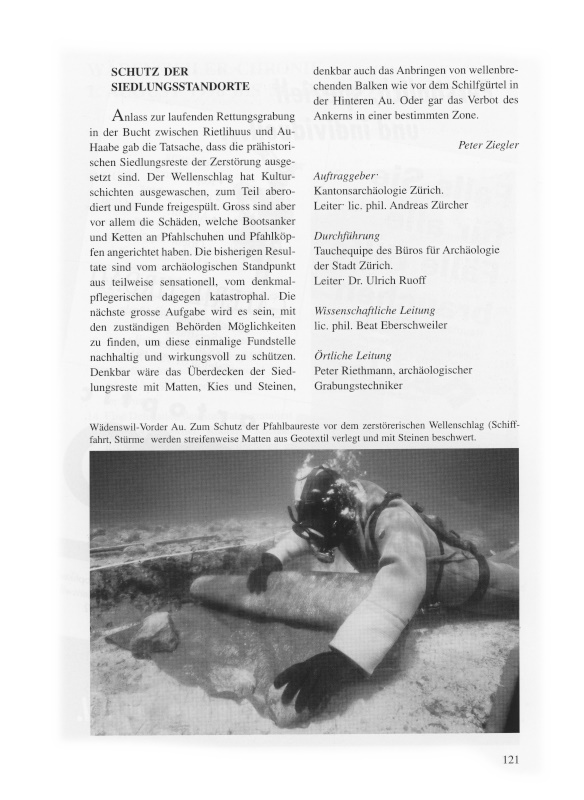 Anlass zu laufenden Rettungsgrabung in der Bucht zwischen Rietlihuus und Au-Haabe gab die Tatsache, dass die prähistorischen Siedlungsreste der Zerstörung ausgesetzt sind. Der Wellenschlag hat Kulturschichten ausgewaschen, zum Teil aberodiert und Funde freigespült. Gross sind aber vor allem die Schäden, welche Bootsanker und Ketten an Pfahlschuhen und Pfahlköpfen angerichtet haben. Die bisherigen Resultate sind vom archäologischen Standpunkt aus teilweise sensationell, vom denkmalpflegerischen dagegen katastrophal. Die nächste grosse Aufgabe wird es sein, mit den zuständigen Behörden Möglichkeiten zu finden, um diese einmalige Fundstelle nachhaltig und wirkungsvoll zu schützen. Denkbar wäre das Überdecken der Siedlungsreste mit Matten, Kies und Steinen, denkbar auch das Anbringen von wellenbrechenden Balken wie vor dem Schilfgürtel in der Hinteren Au. Oder gar das Verbot des Ankerns in einer bestimmten Zone.